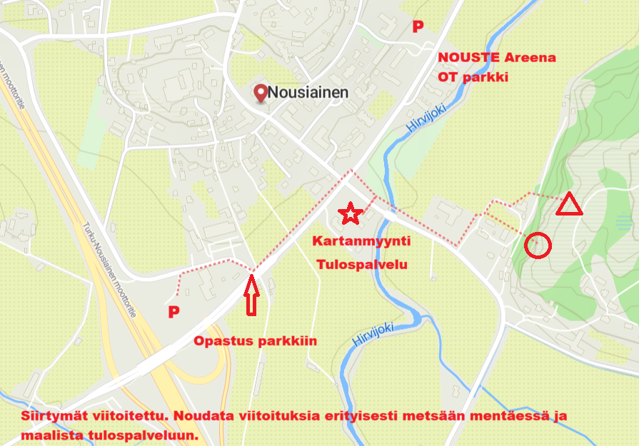 Jotta pääsemme käsiksi näihin hienoihin maastoihin, joudumme järjestämään parkin hieman sivummalle. Ensisijainen pysäköinti sijaitsee Mietoistenkujan sorakentällä. Opastus alkaa Lemuntie 28 kohdalta. Omatoimi parkkipaikkoja on myös Nouski Areenan pihalla. Kummastakin on kartanmyyntiin yhtä pitkä matka. Sorakentältä on opastus kartanmyyntiin joka on seurakuntakodin pihalla Maskuntie 8. Seurakuntakodin pihalta alkaa viitoitus lähtöön. Maalista on viitoitus tulospalveluun. Viitoituksia on seurattava, älä eksy pihoille. (katso kuva)